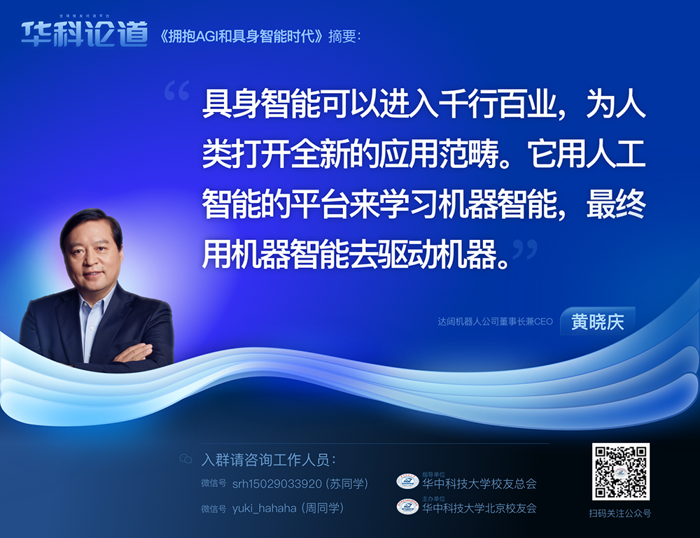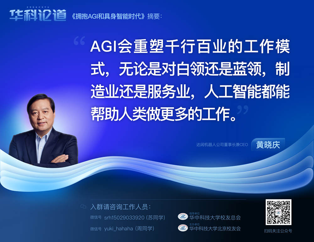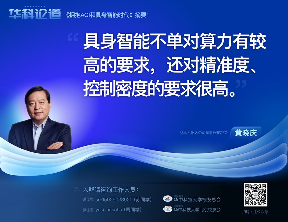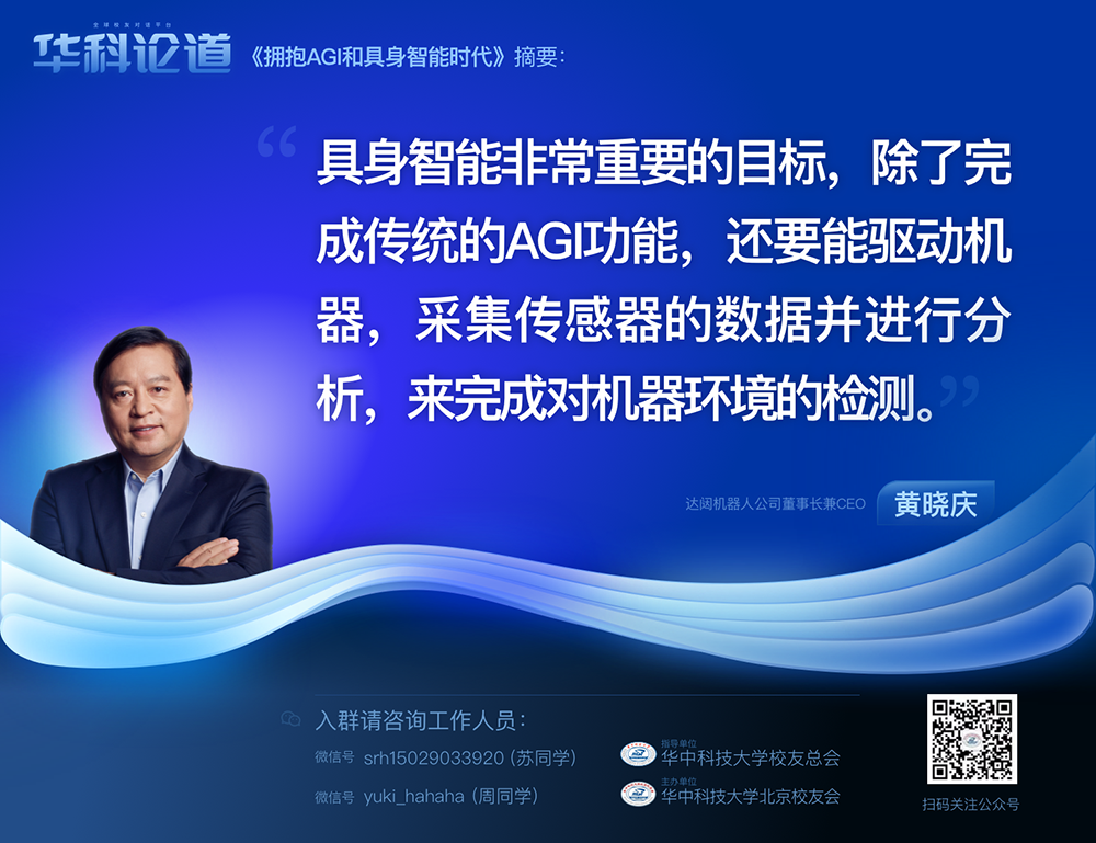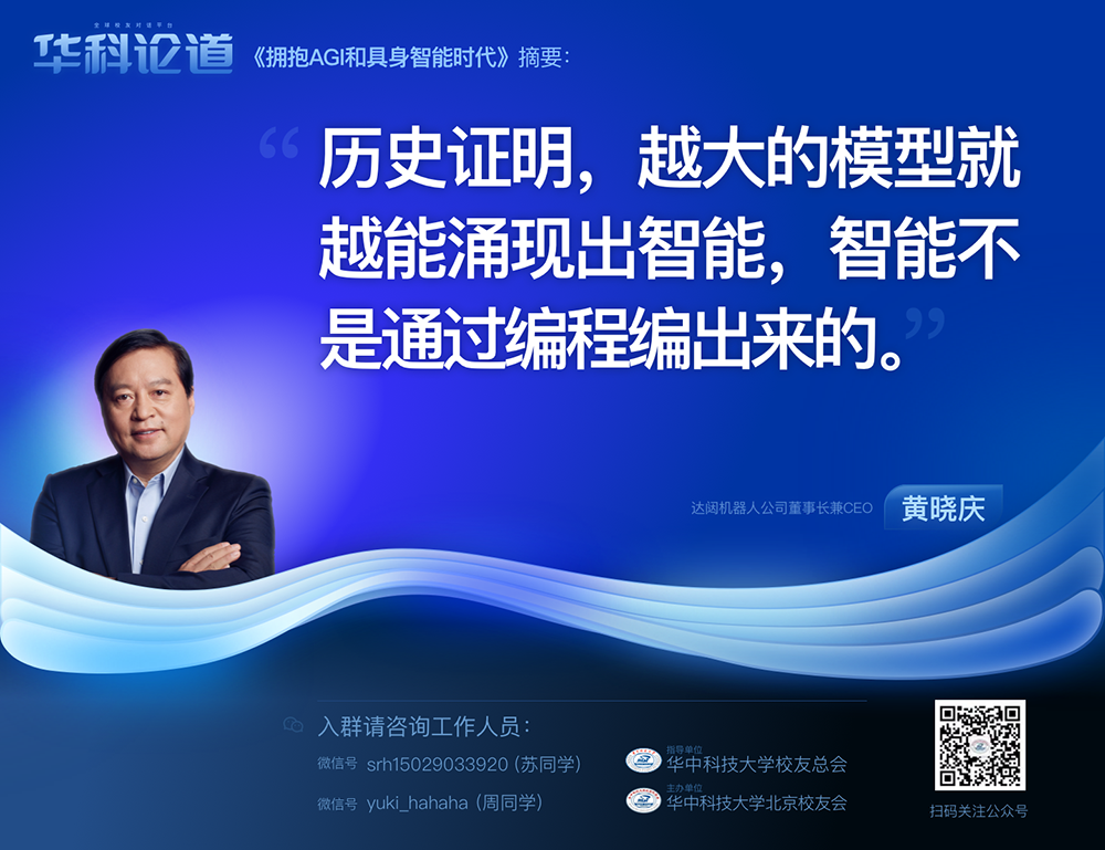 1月30日,在第五十五期「華科論道」上,由華中科技大學(xué)北京校友會(huì)主辦的活動(dòng)迎來(lái)了一位特別嘉賓——達(dá)闥機(jī)器人公司董事長(zhǎng)兼CEO黃曉慶先生,他帶來(lái)了「擁抱AGI和具身智能時(shí)代」的主題演講,為廣大校友帶來(lái)了精彩紛呈的分享。