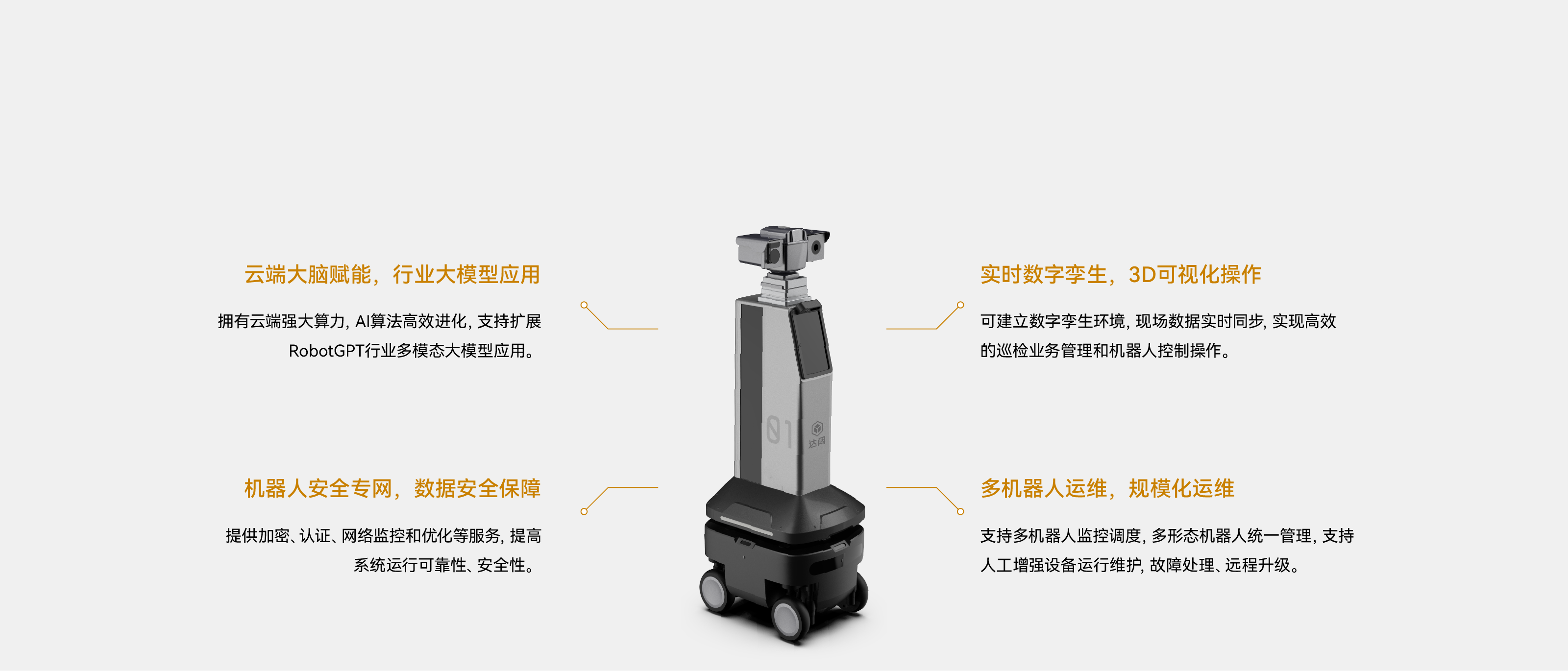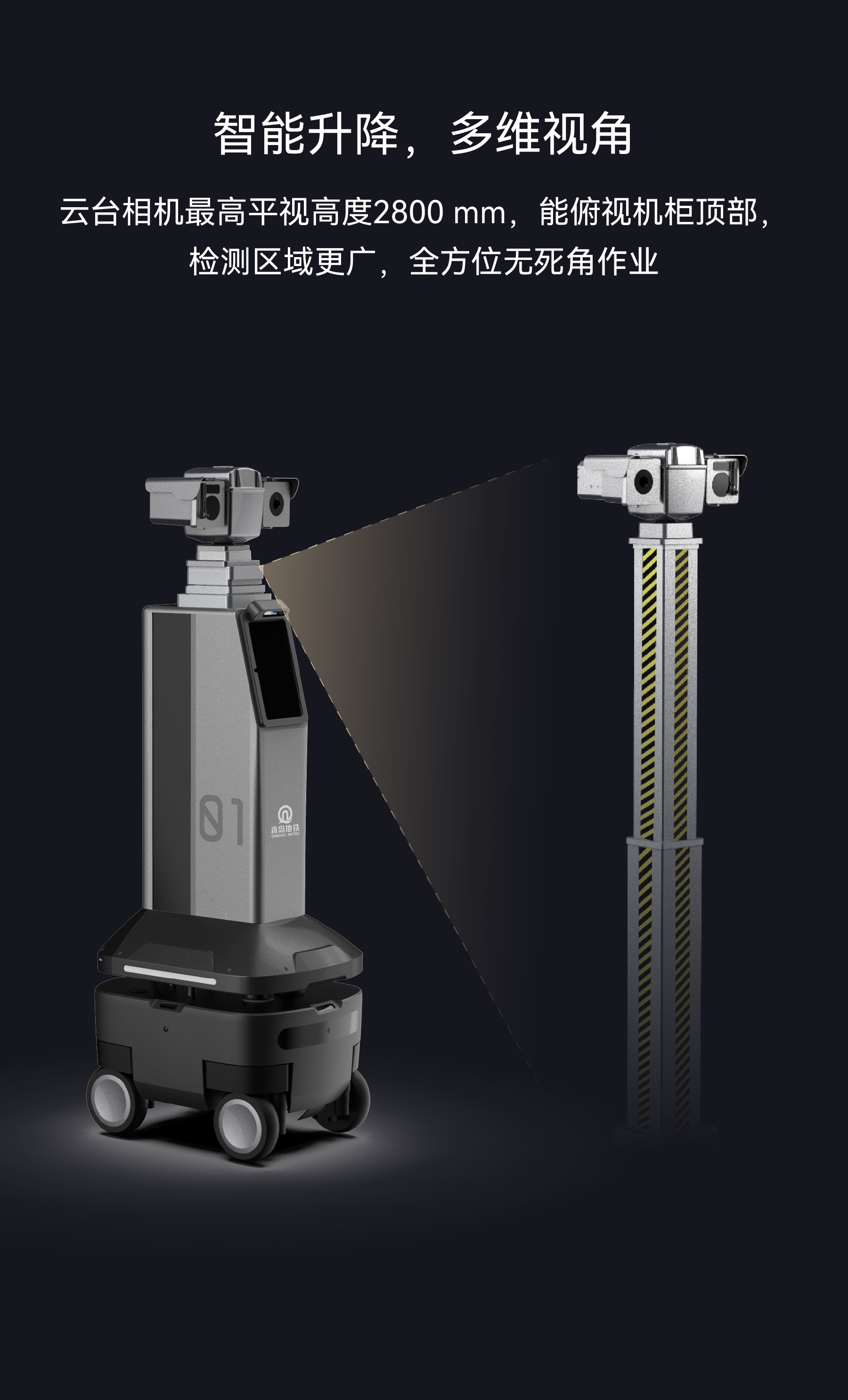 云臺相機(jī)最高平視高度2800 mm,能俯視機(jī)柜頂部,檢測區(qū)域更廣,全方位無死角作業(yè)
