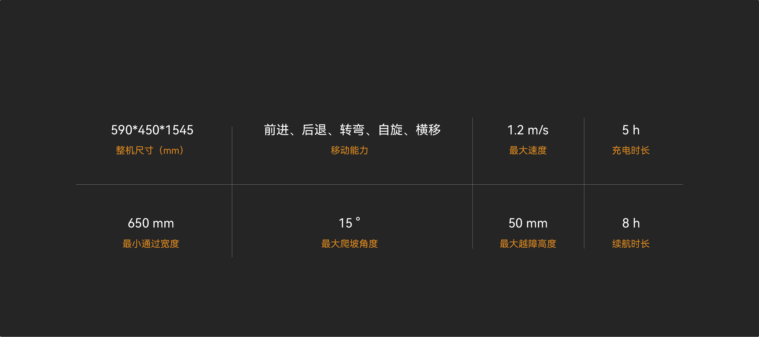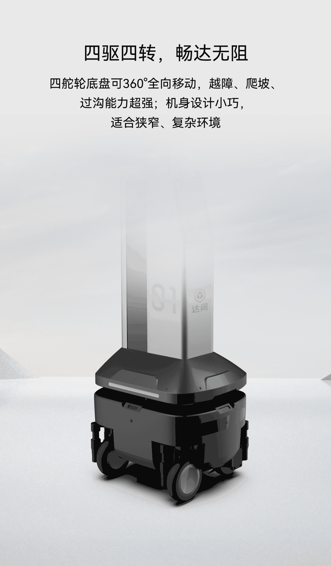 四舵輪底盤可360°全向移動,越障、爬坡、過溝能力超強(qiáng);機(jī)身設(shè)計(jì)小巧,適合狹窄、復(fù)雜環(huán)境